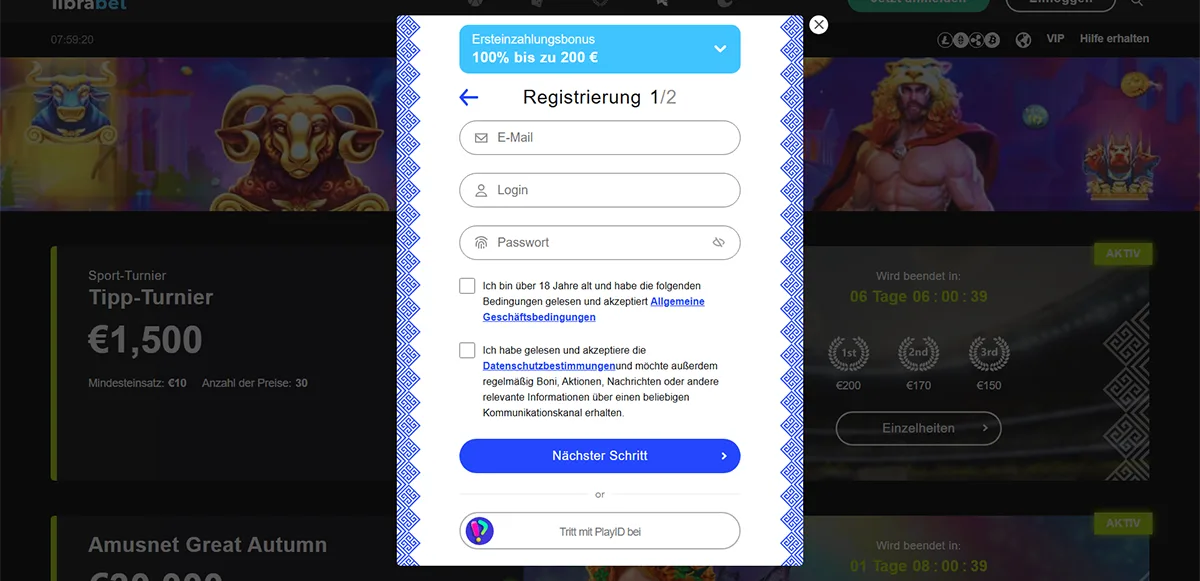 Unser LibraBet Willkommensbonus umfasst einen 100% Bonus bis zu 500€ plus 200 Freispiele für neue Spieler. Die Mindesteinzahlung beträgt nur 10€, und mit der ersten Einzahlung erhalten Sie zusätzlich einen Gratis-Pick bei der Bonuskrabbe.